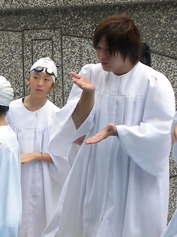 我們教會的受洗儀式很好玩,在游泳池。牧師與弟兄左右抓住我,然後將我後仰壓入水中(很像摔角的雙人合體技),我立即嗆到了。雖說受洗只是形式,但我想在文學上也可以有象徵意義。