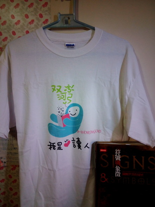 整理房間時找到這麼一件衣服,這是《双河彎》生活文學誌送我的。當年我寫了一篇關於《告白》的書評,被双河彎錄用,並封為愛讀人,所以致贈了這麼一件尊榮的衣服。這件衣服可以隨意由我印刷一行字,我請出版社印上「WORD is GOD」,有人以為我在歌頌比爾蓋茲......確實也是啦,我幾乎一輩子都是靠Word賺錢;然而事實上,此語乃出於聖經《約翰福音》第一章第一節:『太出有道,道(WORD)與神(GOD)同在,道即是神。』