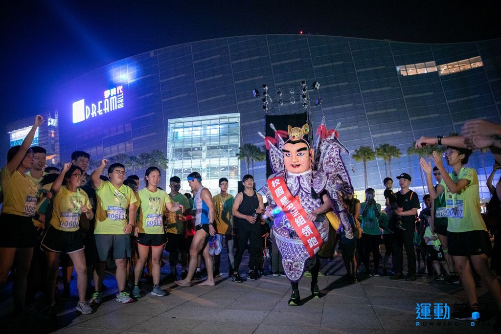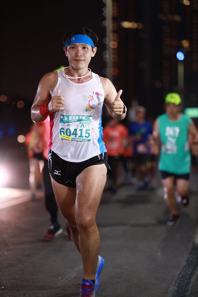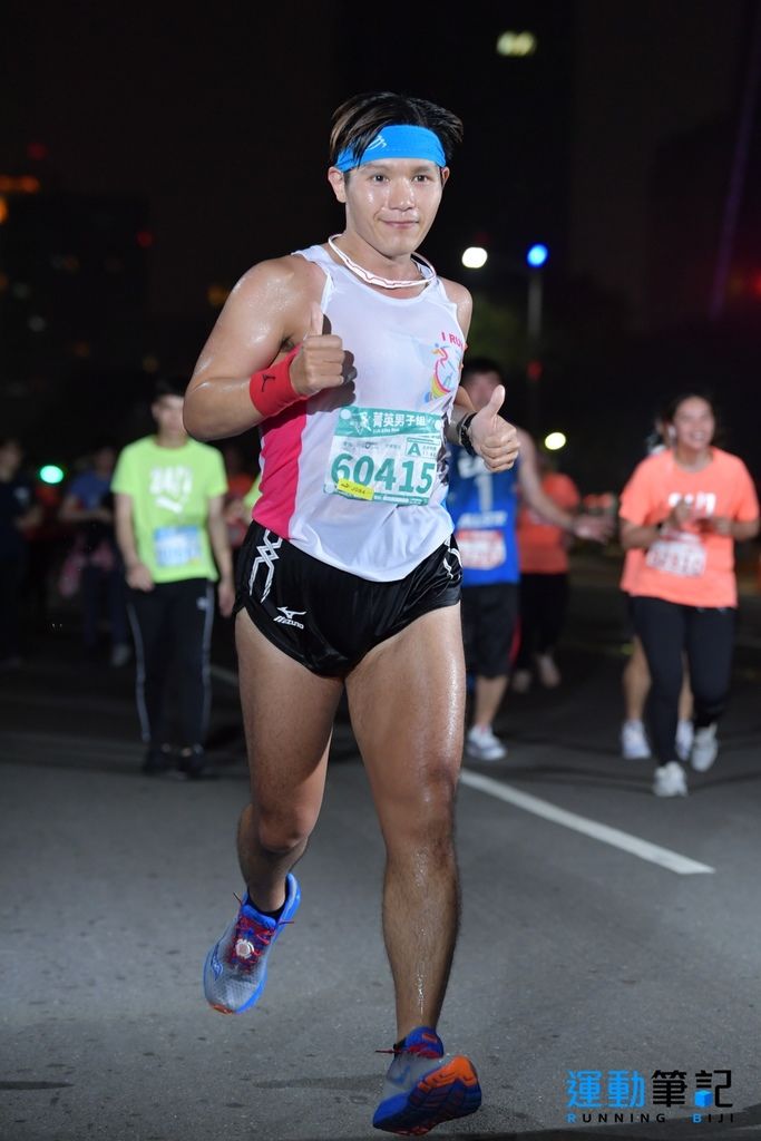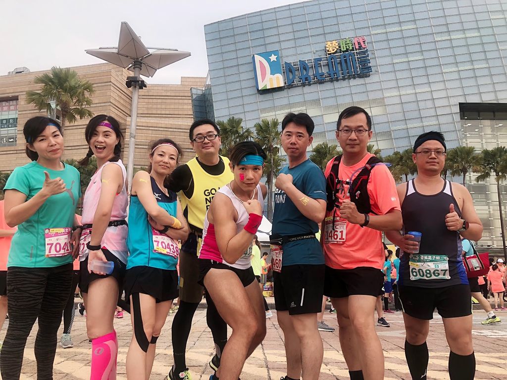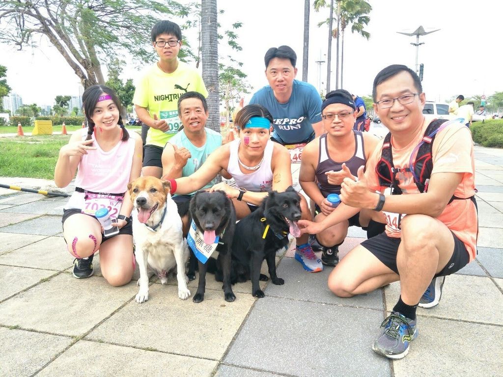 五點四十起跑的比賽,讓人不知該怎麼吃比較好。我選擇少量多餐,中午吃義大利麵、鬆餅。到了比賽前約兩小時再吃一根香蕉,比賽前一小時又喝了機能飲料。然後很順利的比賽前還上了個大號,超級舒服的準備起跑,大家很開心在身上黏上了紋身貼紙,可惜很不牢靠,幾乎跑到一半就掉了。不過還是很好玩,另外今天帶了許多止汗帶,給平常跑步都戴帽子的跑友們使用(讓琴琴跟嵋嵋變得更美了)。夜晚的比賽不用防曬對大家來說比較特別。開賽前還看到了檸檬家族黃檸檬(跑了百場全馬的狗狗),跟現役的全馬狗黃黑糖、黃饅頭,黃大哥說檸檬已經退休了,但今天來幫大家加油,真讓人感動,祝福檸檬家族,看到牠們就很開心。